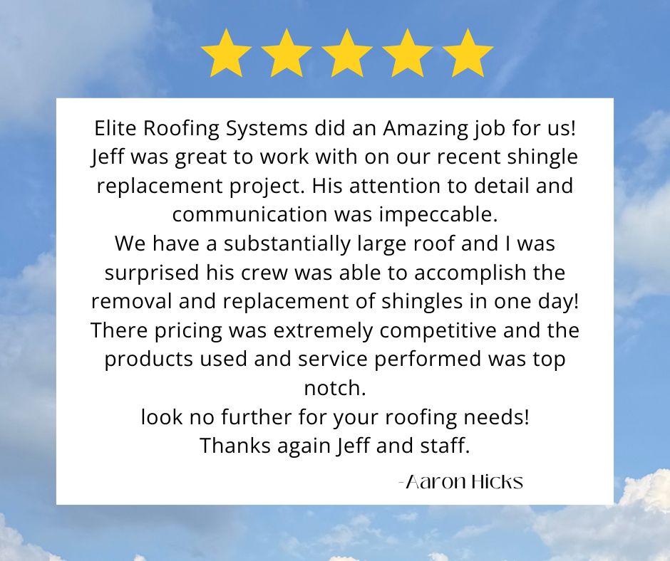 Elite Roofing Systems did an Amazing job for us! Jeff was great to work with on our recent shingle replacement project. His attention to detail and communication was impeccable. We have a substantially large roof and I was surprised his crew was able to accomplish the removal and replacement of shingles in one day! There pricing was extremely competitive and the products used and service performed was top notch. look no further for your roofing needs! Thanks again Jeff and staff.